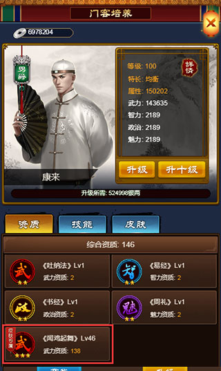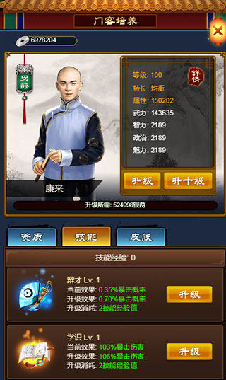 如上图所示,门客的组成部分主要分四大块:等级属性,资质,技能还有皮肤。
