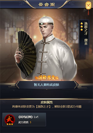 列如我们的老伙计康来,他的其中一款皮肤便是增加武力资质的哦