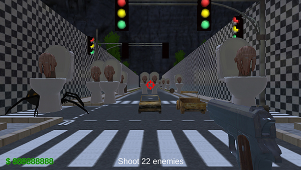 《马桶人猎手》是一款非常有趣的魔性动作射击游戏,背景设定在外星马桶人入侵地球的奇幻故事中。玩家需要通过射击这些强大的敌人来保护自己,并在规定时间内尽可能多地消灭对手。游戏中提供了多种武器选择,比如手枪、冲锋枪、散弹枪甚至火箭筒,让玩家可以根据不同的场景和敌人特点灵活应对。