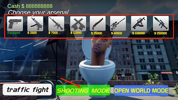 2、进入游戏主界面,上面包括手枪、冲锋枪、步枪、散弹枪、狙击枪、火箭筒等武器,选择一个喜欢的武器,然后点击【SHOOTING MODE】射击模式,