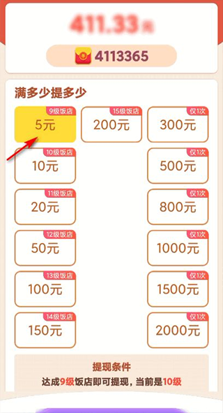 1、打开我的我的饭店红包版,在游戏中接待客人数量达到要求即可升级。