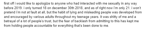 然而也有很多一部分人依然选择支持nami,因为在那封yoyo举报信中实际上yoyo自己承认了自己是一个"习惯性"隐瞒自己年龄的"惯犯",并且在私人生活上相当的混乱,事实上在二人分手之前yoyo就已经出轨了,然而当年她没有说出来,却在nami第一部商业作品并取得了一定的名气之后才跳出来用长篇大论的万字小作文讨伐nami不免有碰瓷捞钱的意思在里面。