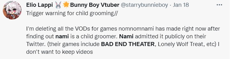 而好景不长,根据yoyo所说,nami在2015年末(也就是二人发生关系后不久)的时候就开始质疑yoyo是否成年,并且在得到肯定的答复后立刻提出了分手,yoyo声称nami此后拒绝与其联系并且将其拉黑,此事在2个月前在推特上被爆出,当即引起了轩然大波(nami在LGBT社区中的人气很高),很多同人作者愤怒的删除了全部与nami相关作品的同人以对此表示抗议,而nami本人也因此被解除了几乎所有合作关系。