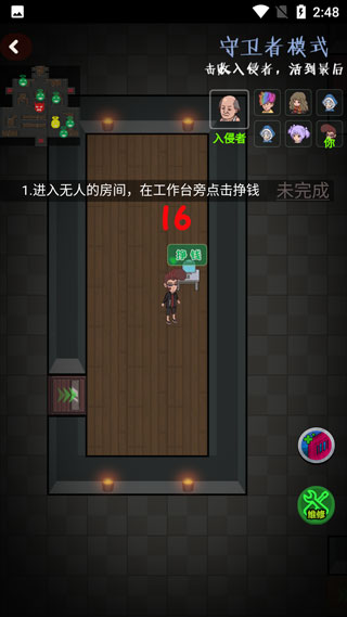 3、进入游戏,选择一个无人的房间,开始挣钱,选择的房间很重要,一个是门要在上方的位置,二尽量选择较远的位置,选择门在上方的位置是因为入侵者在攻击的时候可以清晰的看到门的血量,如果门在下方的话可能会和入侵者并合在一起,这样就无法看到门的血量了,偏远位置可以让猛鬼不会第一时间走到玩家这里进行攻击,优先攻击其他队友的房间