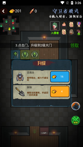 5、在游戏里面门升级也是有技巧的,因为入侵者在攻击时候会会降低门的血量,在血量快不足的时候升级门可以将血量瞬间拉满,这样就可以持续抵挡住入侵者的攻击了,然后继续发展自己的武器;
