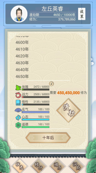40年,你拥有了多所自己的洞府,便与道侣一同修真历练,途中为降服稀有神兽耗费多年修为,却又因命格尚好成功抵挡九重天劫,渡劫飞升