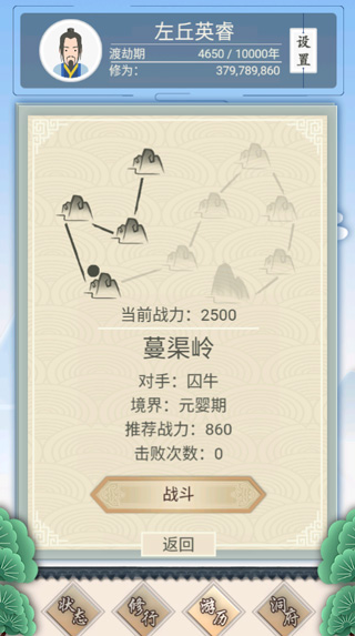 5、推图:前中期刷刷拿资源还行,后期完全鸡肋,我反正懒得打,浪费五秒钟修为也不给多少。最后一个图boss经验倒是给挺多,问题是我都大乘了要那玩意干啥啊兄弟。(仙人别鸟他,这玩意就是个饼,制作组应该是想搞成让你分几次搞死他,但是目前你打完了之后不扣百分百血量)
