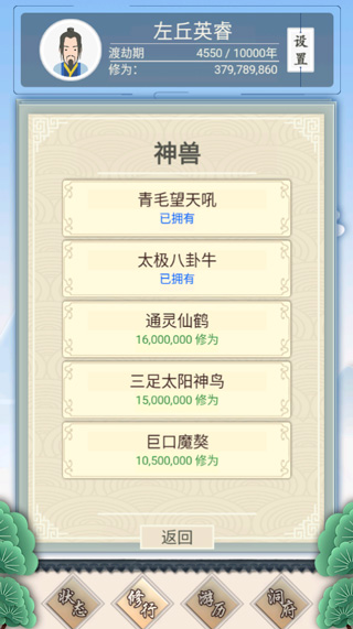 2、神兽部分:一个前期没用后期指着他活命的玩意。前期出了别管他,会有随机事件叫你帮忙,你帮忙之后会送你。中期随便养几只送的用来蹭点小修为,主要还是用来刷 人气和心态。到渡劫期之后迅速买金翅大鹏鸟,攒6400w升级成神兽之后去混天仙大会,一次70w+经验(这里每打一次都会掉1点人气,掉到七八十了就打几次地仙回上来就行)能不能第一世就狗到大乘全靠他了。大成之后把三足金乌买了,攒2亿5进化成凤凰,就可以愉快的混天仙会一二名了。(评论区我看有老哥说每三千年有随机事件能给宠物加攻击力,可能我比较倒霉,一次都没遇到过,所以这点我也搞不懂怎么弄)