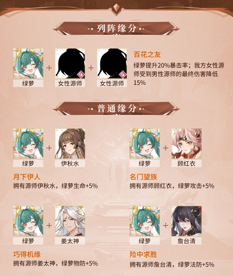 虽然在原作小说中,登场源师们的实力不尽相同,但在《元尊》手游中,全员皆是天骄,未来尽在我手,我命由我不由天!在游戏中,就算是普级源师,同样可以通过培养,最终升级到绝世级源师,独挡一面。而手游中的所有源师都有独特的功效性,利用好这些特性将大大提高自身强度,降低游戏难度。源师与源师之间存在不同的羁绊,在羁绊系统加持下,不同羁绊所附加的属性也迥然不同,大大增强了游戏的策略性。