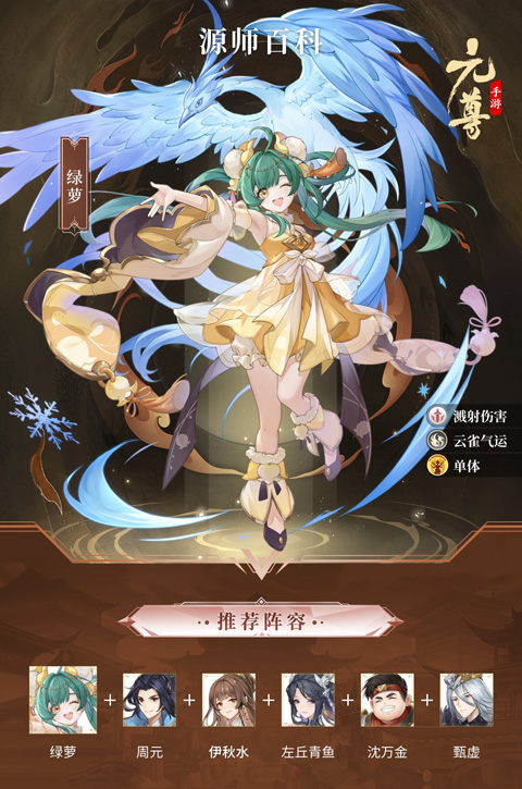 小萝莉一枚,绿萝是万兽王朝小郡主,初登场为天关境顶峰,拥有宠物“小寒”、三头灵鬼蟒"小灵"。与周元在古域相识,看上拥有祖饕血脉的吞吞,打算购买但被拒绝,便死缠烂打的跟上来,之后成为周元的伙伴,一同前往圣迹之地。兽心通明者,可与源兽心意相通,加上所修功法配合源兽可发挥惊人的实力,但对过于强大的源兽则无效。之后加入百花仙宫。