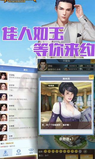 2、玩家在游戏中可以购买豪车和豪宅,和各种美女进行约会,玩家需要选择和美女约会的场景,例如室内写真、皇家餐厅、电影院、商业级、演唱会等等,玩家需要通过和女生的亲密度来选择场景,如果和女生的亲密度比较低,玩家直接选择室内写真的话,女生很可能会生气离开哦,所以玩家在选择约会场景时,一定要慎重。