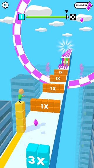 游戏中,玩家在一条道路上进行冲浪,而你控制的一个小人脚下踩着一个方块前进,在前进的道路上有着很多的障碍,只有获得更多道路上的方块,然后提升你的高度之后才能通过沿路的障碍,玩法就是这么的新颖还有具有趣味性。操作的方法很简单,只需要一个手指左右滑动就可以了,但是带来的乐趣是非常巨大的,获得的沿路方块越来越多你就会变得更加的高,并且是没有限制的变高。