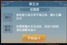 第五关的夜霓裳估计是属于个小BOSS。她会在4秒之后使用技能,而且如果被技能命中会存在禁锢、沉默、大范围掉血等问题,因此最好就像战斗要点所说的,迅速解决战斗。