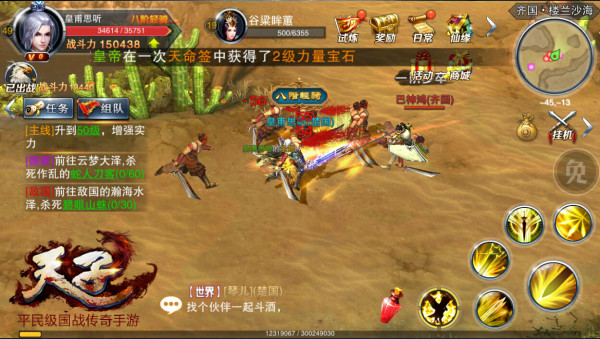 《天子》手游中存在着水火不容的齐楚两国,无论是定时开放的国战时刻,还是国家任务的短兵相接,亦或是抢夺boss时的争分夺秒,两国人马无时无刻都在比拼当中。其中要数野外首领刷新的时刻最为激烈了,只要系统提示一出,两国人马就会火速前往制定地图,击杀boss来获取更多的资源,俨然成了一场国战前夕的资源争夺战。