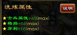 普通洗练:洗炼消耗洗炼石,随机变更洗练属性种类并有概率提高条洗练属性的等级。洗炼石可以通过副将副本以及卖出军备所得哦!