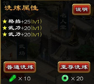 至尊洗练:洗炼消耗积分,随机变更洗练属性种类并有较大概率提高洗练属性的等级。