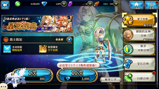 3.活动召唤:这一类包含的比较多,比如:星之庆典召唤、钢铁的女神召唤等等,根据每期活动不同,开启的召唤不同,在这里会出现各种强力的限定角色,所以当有了一定的宝石储备或者已经做好氪金准备的勇士们千万不要错过。