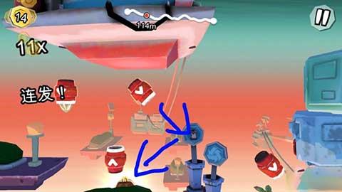 3、充满动感的游戏机制。试着避开小鸟、建筑物以及怪异的机器,以迅速点击的方式来闪躲那些快速移动的障碍物,精确瞄准下一个要前往的炮弹位置,或是直冲天际来避开各式各样的障碍物,迅速地前往目标。