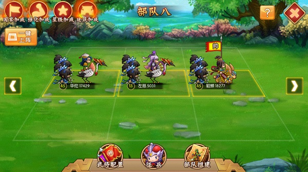 这是一队法攻队伍,左慈的技能是给友方加技能伤害,华佗的技能除了加血之外还给友方增加大量的谋略数值直接影响技能伤害。貂蝉就是在前面挡枪同时提供控制和法术伤害的。这队伍看似很弱,实战中却非常实用,虽然不如前几对菜刀队伍那样摧枯拉朽的干翻敌人,但是突然间的巨大伤害也是非常刺激的。