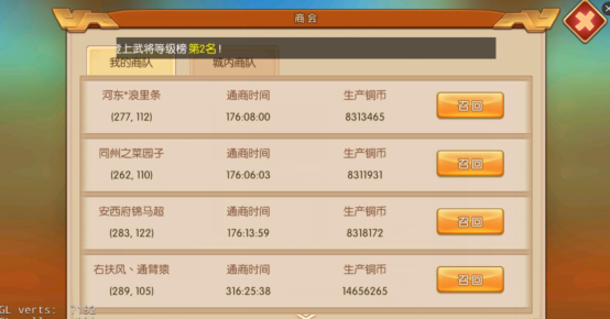 3、有了商队之后,你可以在野外地图把商队派遣出去。不管是盟友的主城还是敌人的主城都可以派遣商队进行通商,通商过程中你的商队将会根据通商时间赚取铜币,你可以在商会界面里下达命令召回商队,等到你的商队回到你的城里的时候你的商队赚的钱就到你账上了。
