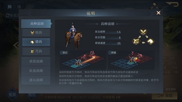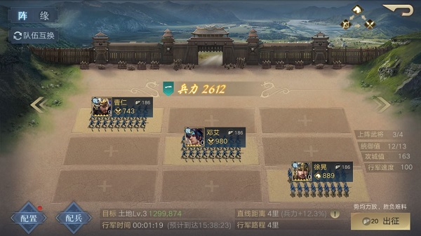 兵种搭配、战术布置在“布阵”中能够直观清晰地体现。整个阵列共有3x3、合计9个布阵位,可以自由摆放武将位置,共可上阵4个武将和1个器械。