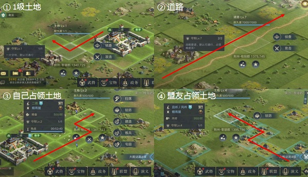 在游戏地图中开始便散布着许多的1级土地,主公们可以纵览1级土地的分布,借助这些可直接通行的地格,找出能绕过高级土地的行军路径,快速进行土地占领,省去低效的铺路时间。