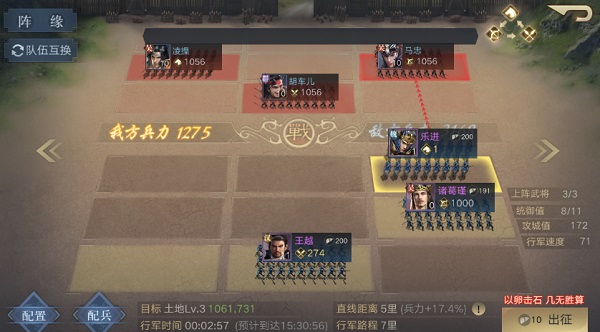 1~3级的时候攻打比较简单一些,只需要战力值达到相对应的需求以后攻打就可以。4级到5级的时候难度就更大一些,特别是第1次攻打的时候,一定要多加注意,可以使用侦察功能,了解到敌方的战力详细情况以及兵种配置。可以根据敌方的阵容调整己方的武将站位,这样能够将伤害提到最大化。