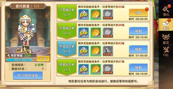 2、15级开启铁匠任务后,委托任务记得及时接取并按时领取,获得的SP点可以增加强化G化成功率,还能增加分解时获得稀有道具的几率,早学早享受~