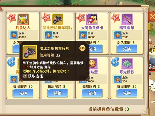 8、除了完成各种任务以外,若初心者们身上有鱼饵的话,也可以选择去钓鱼。钓鱼可以获得随机的材料和鱼油。鱼油可以在鱼小店兑换各类对冒险有帮助的道具,还包括专属摩托坐骑和专属称号哦!