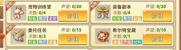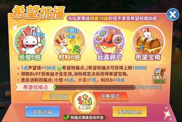 11、当天任务全部结束后,获得的声望点会1:100转化为希望祝福点,冒险者可以利用希望祝福点去推荐练级点进行挂机获取6倍收益!除了可以获得经验以外还能获取各类丰富的道具哦!