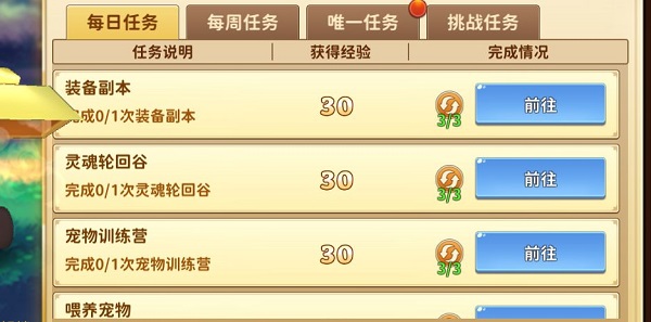 4、36级左右时第一天的主线会暂时完成,别急着下线,这个时候记得把宠物训练营、装备副本、委托任务的剩余次数全部打完,获取更多的资源与经验!