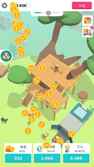 3、只要开始游戏就会源源不断获得收益,通过增加工人的数量,提高工人的效率,升级货车的容量,你的效率将会原来越快,还有不定期出现的投资人,身着奇妙黄色紧身衣的功夫熊猫,乘着飞碟出现的神秘帮手祝你一臂之力哦!