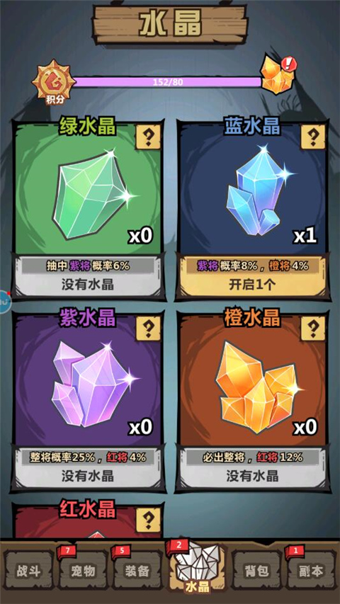 在主界面的下方就能直接进入到水晶页面,从中可以发现有不同颜色,从最基础的绿水晶,蓝水晶,一直到最高红水晶,开启之后得到道具不相同。其中绿水晶开启之后主要包括狗粮和紫将,其中绝大多数都是狗粮,蓝水晶里包括精铁,紫将、橙将等,最多的是精铁。至于红水晶开启之后能够获得5份奖励,第1份奖励为武将整卡,其他4份为点券。