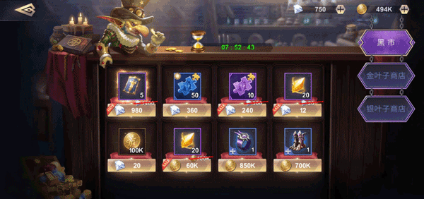 除了酒馆可以招募英雄,黑市、金叶子商店、银叶子商店等也可以获得皇家招募令,英雄碎片、英雄卡牌等,可以优先存钻石购买黑市里的性价比超高的5折皇家招募令哦!各种商店里也有不少高级道具以及英雄卡牌,可以用各玩法产出的代币购买,可以点击右上角的道具查看代币需要在哪些玩法中获得。
