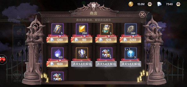 合理利用宝箱中获得血瓶,可以帮助领主恢复英雄的血量,通关更顺利哦。通关层数越高,解锁的商店商品越多,奖励越丰富,领主可以用钻石兑换想要的商品。