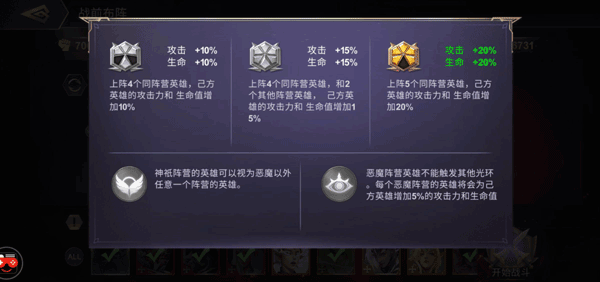 当三大阵营的同阵营英雄满足一定数量时,队伍还能够得到强力的战力增幅。神祗阵营的英雄,可以视为除恶魔以外任何一个阵营成员上阵,而每一个恶魔阵营的英雄,则可以为己方英雄的战力提供加成(具体数值如下图)。领主可以利用这一特点,根据敌方英雄阵营和己方同阵营英雄数量,灵活选择上阵英雄,凭借克制关系和增益BUFF,轻松拿下胜利