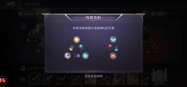 各阵营之间,存在着属性上的克制关系:圣光联盟能够克制月影同盟,而月影同盟又对自然之力有压制作用,自然之力则对圣光联盟效果拔群。而神祗和恶魔之间,则互相克制。