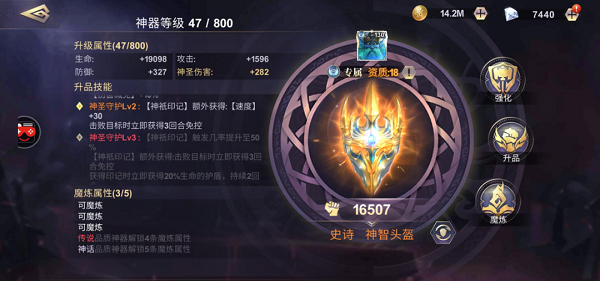 领主等级达到43级后将开启神器系统。领主可以到锻造台中对神器进行强化、升品、魔炼等操作,打造一件极品神器。