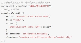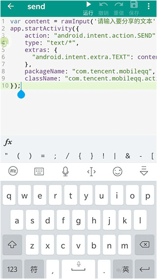 3、提供了很好的手机端辅助编辑工具,我们输入以下代码,这段代码可以实现输入一段文字,并发送给QQ好友:
