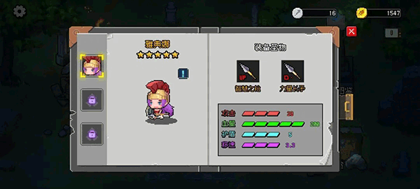 游戏画面是经典的8bit风格,看起来特别舒服,有种复古的清新感。玩起来也轻松,不用氪金就能获得不少资源,广告看几条就足够了。特别是雅典娜这个角色,插秧玩法让我找到了以前玩肉鸽的乐趣,三星四星直接起飞,五星更是无敌的存在。