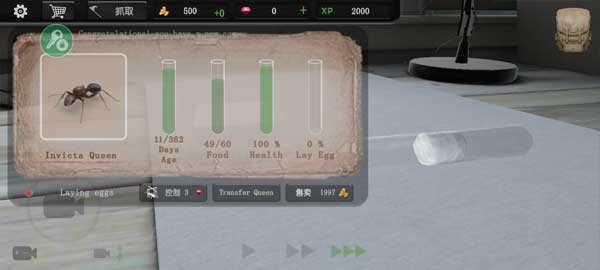 6、下面开始正式的玩游戏吧,先将试管放到桌子上进行筑巢,然后出去获得蚁后和工蚁。