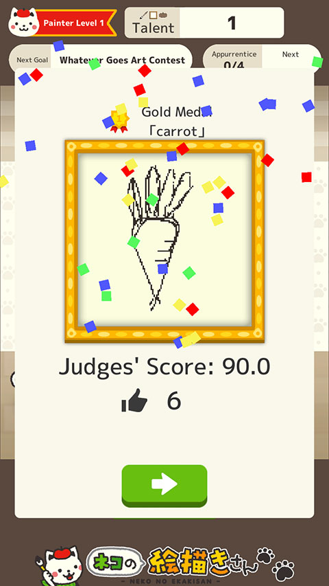 5、游戏中的猫咪不仅是玩家的模仿对象,也是玩家的互动伙伴,它们会根据玩家的画作,做出不同的反应和表情,比如赞美、惊讶、好奇、生气等等。玩家还可以给猫咪起名字、抚摸它们、给它们喂食等等,增加了游戏的趣味性和亲密感。