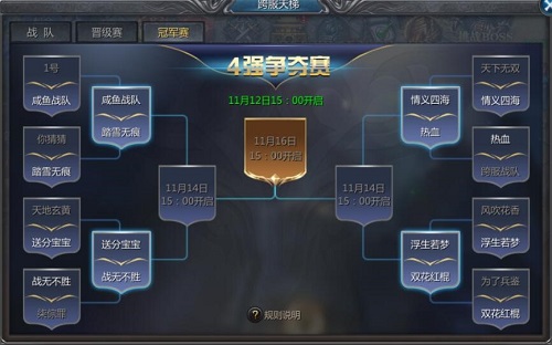 3、冠军赛当天16点赛程结束后,如竞猜的队伍胜利将获得一定比例的元宝奖励。
