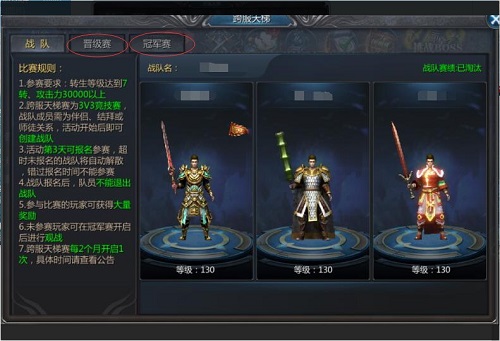 2、跨服天梯赛为3V3竞技赛,战队成员和队长需要为伴侣,结拜或者师徒关系,活动开启时,即可创建战队。
