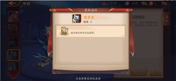 有时候游戏的限时商店内也会出售坐骑,但是价格相当昂贵前期不建议大家购买除非是土豪玩家,后面等大家武将都收集差不多之后可以考虑入手一个比较不错的坐骑,毕竟百分比的属性加成在后期可以与其他玩家拉开极大的差距。