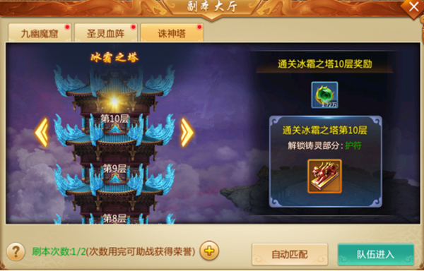 1、组队爬塔副本,爬塔层数越高,奖励越丰富