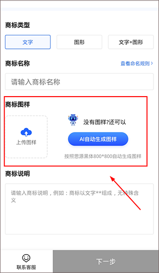 1、上传商标图样:填写商标名称、说明、图样(可自动生成)
