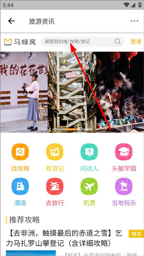 2、进入页面,有找攻略、看游记、问达人、酒店、机票等功能栏,用户可以搜索目的地/攻略/游记;