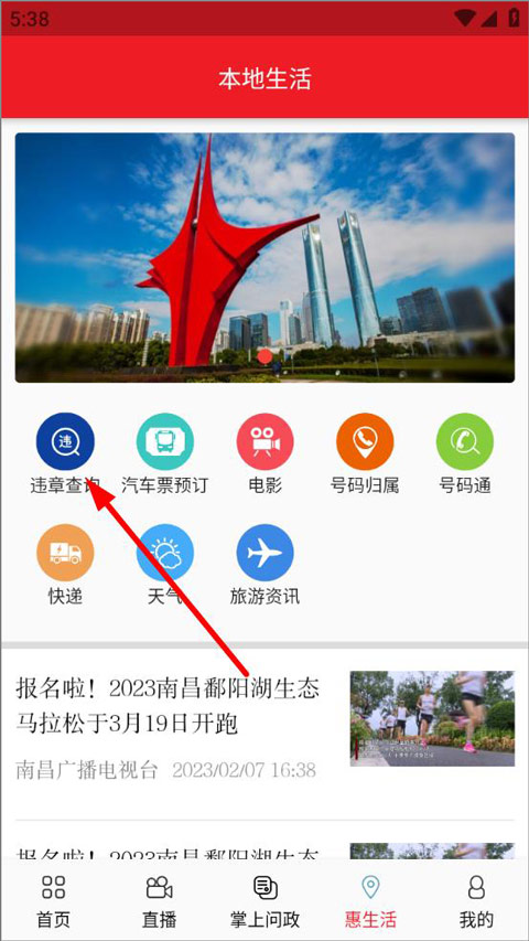 2、进入惠生活页面,本地生活有违章查询、汽车票预订、买电影票、快递查询、天气查询等功能,用户还可以查看本地最新新闻,点击违章查询;