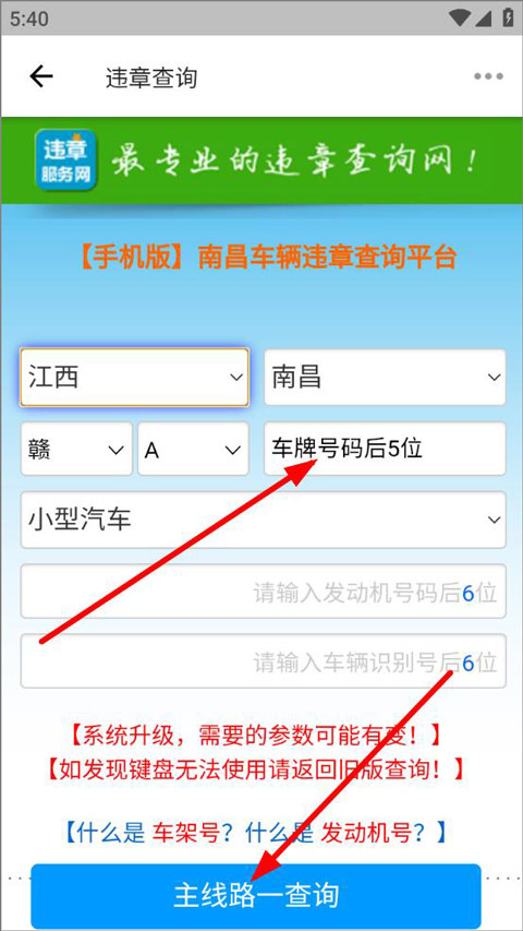 3、进入违章查询页面,用户只需要输入地址、车牌号码、发动机号码、车牌识别号等,点击主线路查询即可;